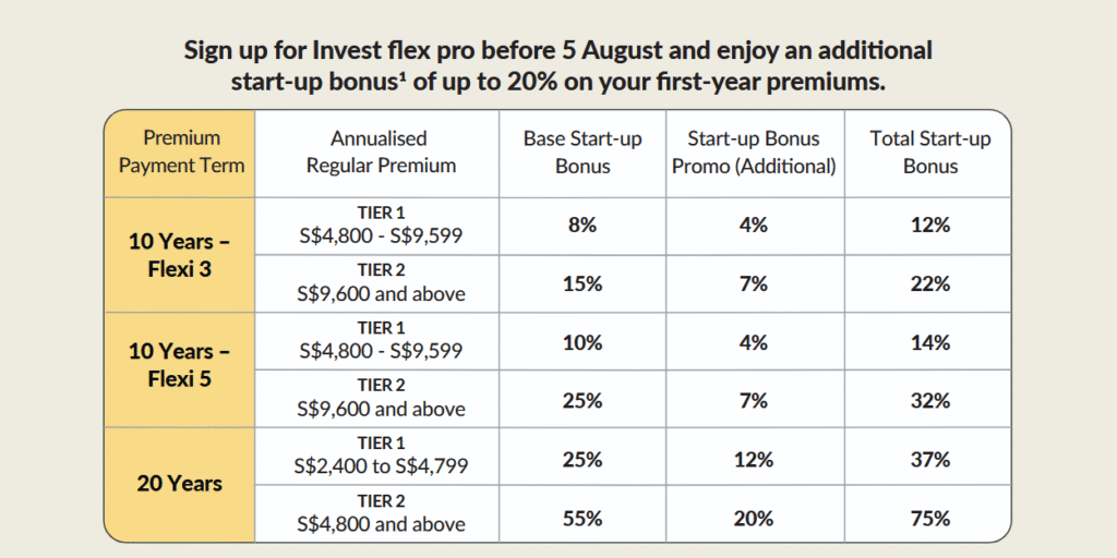 Sign up for Invest flex pro between 6 May to 5 August 2025 and enjoy up to 20% additional start-up bonus1 on your first year premiums.